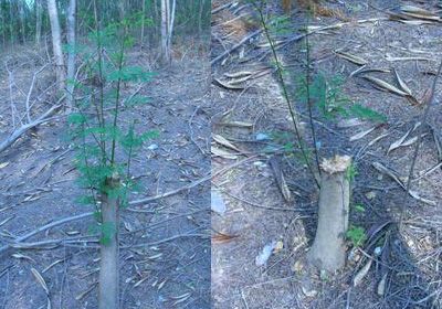 ตัดจำนวน 2 แปลง ๆ ละ 25 ต้น ตัดตอสูงจากพื้นดิน 20 เซนติเมตร ปรากฏว่า ทุกตอมีหน่อเกิดขึ้นในระยะเวลา 7 วัน