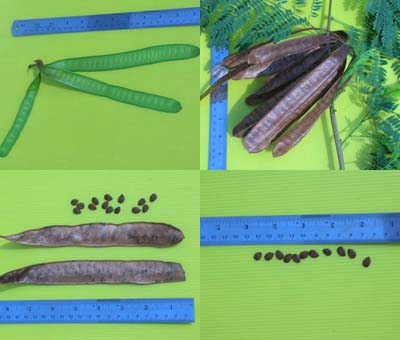 เมล็ด ฝักเกิดเป็นกลุ่ม ๆ มีลักษณะบาง ๆ แบนและตรง มีสีเขียวเข้มและกลายเป็นสีแดงหรือสีน้ำตาลเมื่อแก่เต็มที่